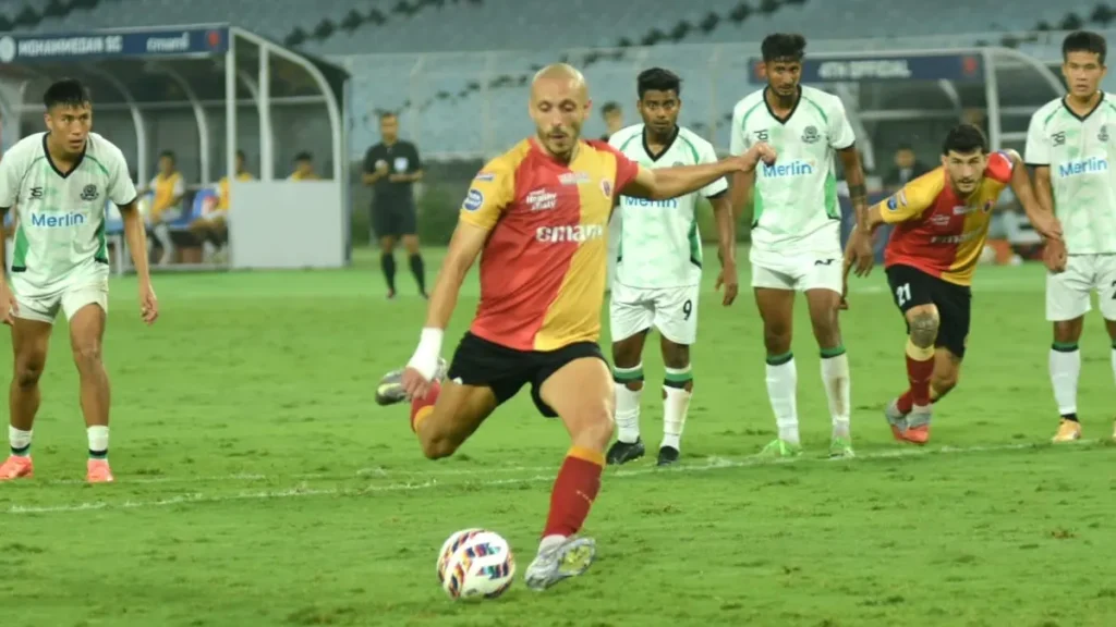 ১২ মিনিটে পেনাল্টি পায় ইস্টবেঙ্গল। মিগুয়েলকে বক্সে ফেলে দেওয়ায় সেই সুযোগ কাজে লাগিয়ে গোল করেন ইউসেফ এজেজারি।