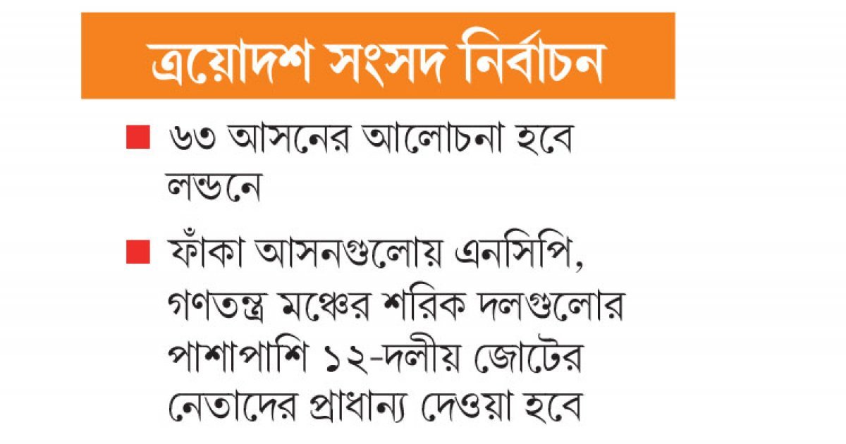 বিএনপির স্থায়ী কমিটির কয়েকজন সদস্য বলেন, ফাঁকা রাখা আসনগুলোয় এনসিপি, গণতন্ত্র মঞ্চের শরিক দলগুলোর পাশাপাশি ১২-দলীয় জোটের নেতাদের প্রাধান্য দেওয়া হবে। এর বাইরে বাংলাদেশ খেলাফত মজলিসের আমির মামুনুল হকের জন্য একটি আসন ফাঁকা রাখা হয়েছে। আন্দোলনে শরিক দলগুলোর নেতাদের প্রার্থী তালিকা চূড়ান্ত হবে লন্ডনে।