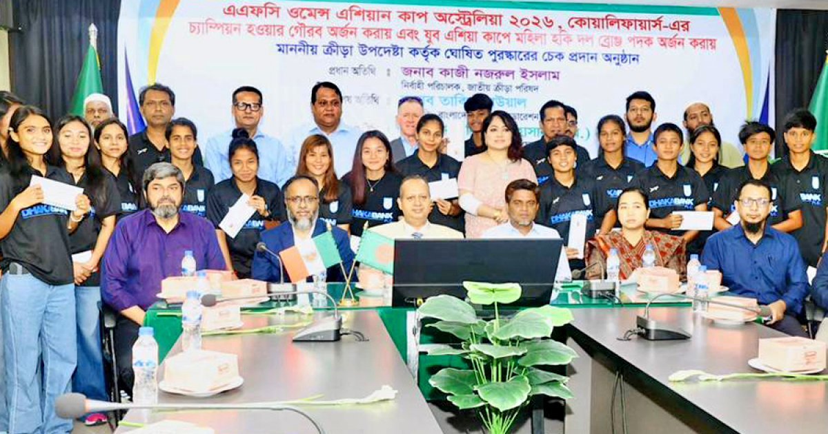সকালে জাতীয় ক্রীড়া পরিষদ আয়োজিত এক অনুষ্ঠানে নারী ফুটবল দলকে পুরস্কারের অর্থ তুলে দেয়া হয়। সেই সাথে প্রথম অংশগ্রহণেই এশিয়া কাপে ব্রোঞ্জ জেতায় অ-১৮ নারী হকি দলকে ২১ টাকা অর্থ পুরস্কার দেয়া হয়।