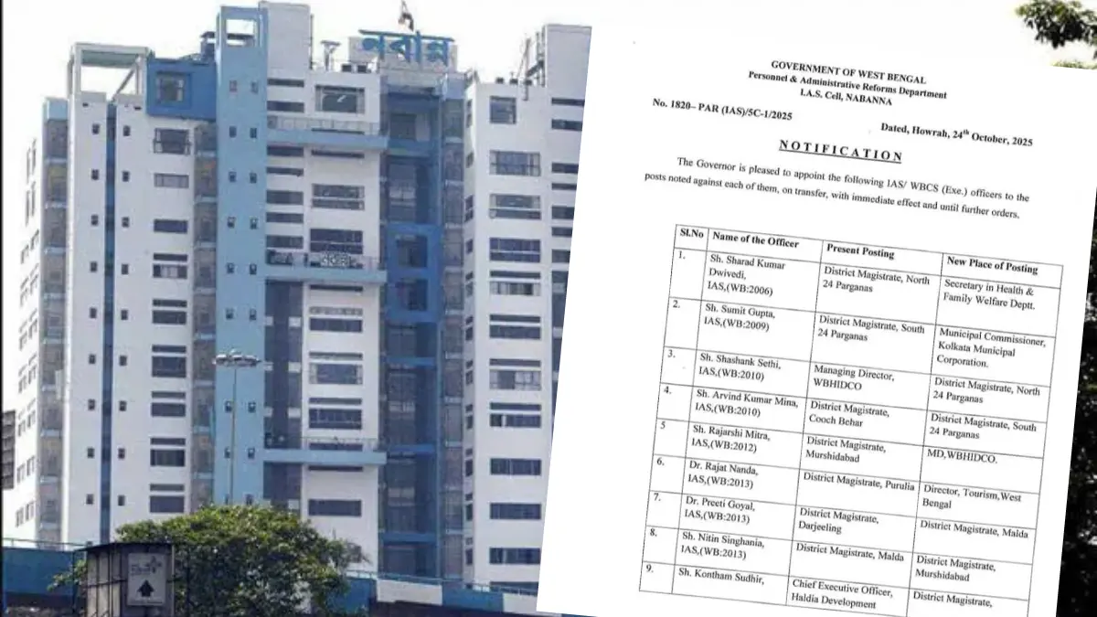 রাজ্যে বিশেষ নিবিড় সংশোধন (SIR) শুরুর আগেই নবান্নে বড়সড় প্রশাসনিক রদবদলের সিদ্ধান্ত নেওয়া হয়েছে। ১০ জন জেলাশাসক, একাধিক অতিরিক্ত জেলাশাসক (ADM) ও সচিব পর্যায়ের মোট ১৭ জন আমলা-কে বদলি করা হয়েছে। সোমবার রাতে নবান্ন থেকে এই সংক্রান্ত বিজ্ঞপ্তি প্রকাশিত হয়।