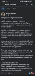রোববার ২৮ ডিসেম্বর, রাত দশটার দিকে জাতীয় নাগরিক পার্টির (এনসিপি) যুগ্ম আহ্বায়ক নুসরাত তাবাসসুম দেওয়া এক পোস্টে তিনি এ কথা জানান।