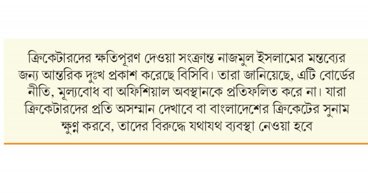 বিশ্বকাপে অংশ না নেওয়া হলে খেলোয়াড়দের কোনো রকম ক্ষতিপূরণ দেওয়ারও সম্ভাবনা নেই, জানিয়েছেন বিসিবি পরিচালক নাজমুল, ‘কেন? ওরা গিয়ে যদি কিছুই না করতে পারে, তাহলে ওদের পেছনে আমরা যে এত কোটি কোটি টাকা খরচ করছি, আমরা কি ওদের কাছ থেকে ওই টাকা ফেরত চাচ্ছি নাকি? চাচ্ছি এই প্রশ্নের উত্তর দেন আমাকে?’ প্রথম বিভাগ ক্রিকেট লিগে যেসব দলের খেলোয়াড়দের বসে থাকতে হচ্ছে বেশ কিছু দল অংশগ্রহণ না করায়, তাদের ক্ষতিপূরণ দেওয়া আর জাতীয় দলের খেলোয়াড়দের না দেওয়া প্রসঙ্গে বলেছেন, ‘তাদের বাস্তবতা আর ১ম বিভাগের বাস্তবতা তো এক না। জাতীয় দলে, কেন্দ্রীয় চুক্তিতে থাকা ক্রিকেটারদের বেতন আছে, চিকিৎসা ভাতা আছে, চোট পেলে বীমা যদি দেয় ১০ লাখ টাকা বিসিবি খরচ করে ১ কোটি টাকা, তাদের সঙ্গে ওদের (প্রথম বিভাগে বঞ্চিত) মেলানো এক হবে না।’