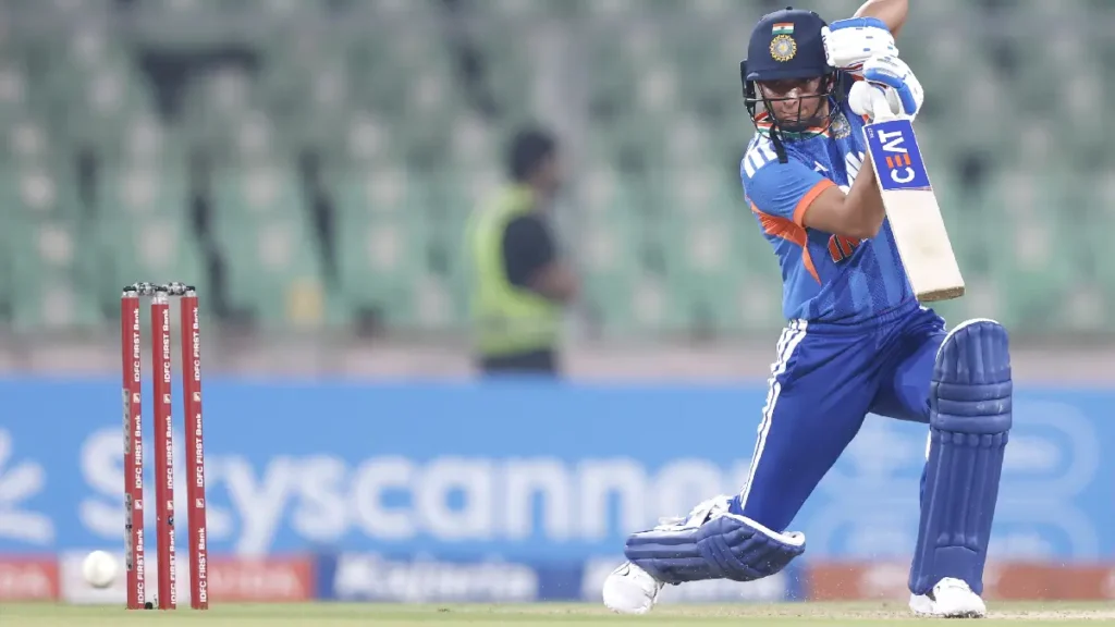 চতুর্থ ম্যাচের মতো ঝড়ো শুরু এবার হয়নি। পাওয়ারপ্লেতেই ধাক্কা খায় ভারত। ধারাবাহিক ভালো ফর্মে থাকা শেফালী বর্মা মাত্র ৫ রানে আউট হন নিমিশা মীপাগের বলে। স্মৃতি মন্ধানার বদলে অভিষেক ম্যাচ খেলতে নামা জি কামালিনি এলবিডব্লিউ হয়ে ফেরেন প্রথম বলেই। ৪০ রানে দুই উইকেট হারানোর পর হারলিন দেওল, রিচা ঘোষ ও দীপ্তি শর্মাও দ্রুত সাজঘরে ফেরেন। নবম ওভারে স্কোর দাঁড়ায় ৬৪/৪, পরে ৭৭/৫—চাপে পড়ে যায় ভারত।