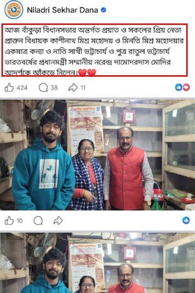ঘটনা ঠিক কী ঘটেছে? জানা যাচ্ছে, প্রয়াত তৃণমূল বিধায়ক কাশীনাথ মিশ্রের মেয়ে শাখী ভট্টাচার্য ও নাতি আয়ুষ্মান পারিবারিকভাবে দেখা করতে গিয়েছিলেন বাঁকুড়ার বিজেপি বিধায়ক নীলাদ্রিশেখর দানার সঙ্গে। তারপরই বিধায়ক নিজের ফেসবুক পোস্টে তাঁদের সঙ্গে সাক্ষাতের ছবি দিয়ে লেখেন, ‘আজ বাঁকুড়া বিধানসভার অন্তর্গত সকলের প্রিয় নেতা প্রয়াত ও প্রাক্তন বিধায়ক কাশীনাথ মিশ্র মহোদয় ও মিনতি মিশ্র মহাদয়ার একমাত্র কন্যা ও নাতি সাখী ভট্টাচার্য ও পুত্র রাতুল ভট্টাচার্য ভারতবর্ষের প্রধানমন্ত্রী সম্মাণনীয় নরেন্দ্র দামোদরদাস মোদির আদর্শকে আঁকড়ে ধরলেন।’ অর্থাৎ তাঁর এই পোস্টে শাখী ও তাঁর পুত্রের বিজেপিতে যোগদানের ইঙ্গিত স্পষ্ট। কিন্তু ঘটনা মোটেই তেমনটা নয় বলে দাবি মিশ্র পরিবারের।